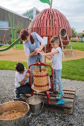 Unter Anleitung des MoMö Teams erhalten Kinder (7 - 12 Jahre alt) Einblicke in die Apfelernte und dürfen selbst ihren eigenen Saft im Obstgarten des MoMö Museums pressen.
